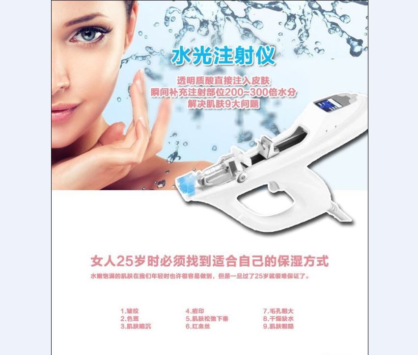 它的原理1:在微针进入前利用声控机将皮肤稍稍地抬起,使得皮肤维持紧实后针头进入到准确的深度用多针来注入营养物.嫩肤皇后与一般补充疗法有很大不同,设计上能在皮肤准确的真皮层1.28MM深度下补充进肌肤玻尿酸所需营养物,注入量的调节是在装备后面的OLED触屏上便可简单的按键调节.另外,微针在出来前就已经放开了注射器的压力,因此不会带来营养物的损耗.属于国际皮肤美容科技最新突破,是爱美一族的福音.
