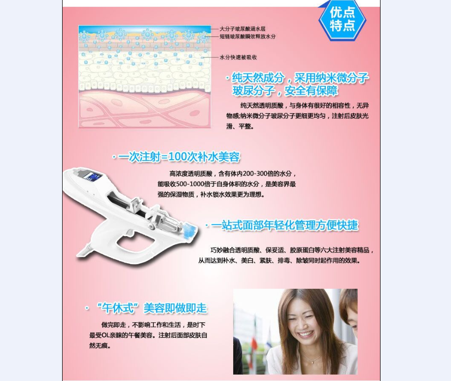补充深度控制精确度高达0.01mm、剂量控制精准量高达0.01cc,是目前高科美容仪器精确度最高的美容仪器;