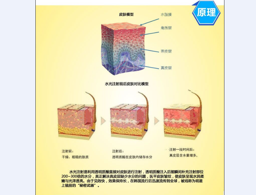 医学研究报告指出,皮肤在22岁左右,新陈代谢开始减慢,真皮层的玻尿酸和骨胶原开始流失了,因此皮肤的锁水能力在不断的下降,皮肤会越来越干燥、敏感、暗淡,细小皱纹逐渐呈现,毛孔粗大。即使勤于敷面膜或做皮肤护理(Facial),水份或各种营养物质都被天然屏障阻隔于表皮层,不能深入真皮深层,所以无法给真皮层补充玻尿酸。