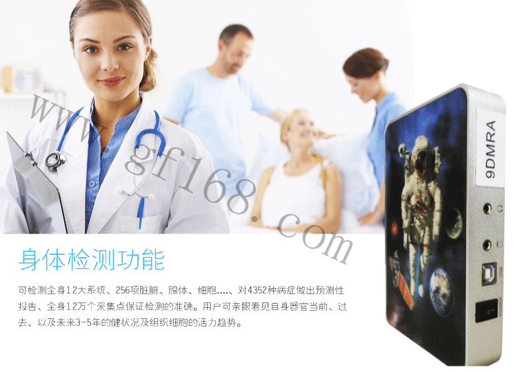 9D-CELL集身体检测、物品分析、修复治疗,三大功能于一体。1.身体检测功能可检测全身12大系统、256项脏腑、腺体、细胞....、对4352种病症做出预测性报告、全身12万个采集点保证检测的准确。用户可亲眼看见自身器官当前、过去、以及未来3-5年的健状况及组织细胞的活力趋势。