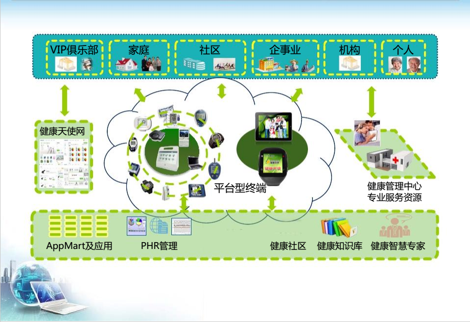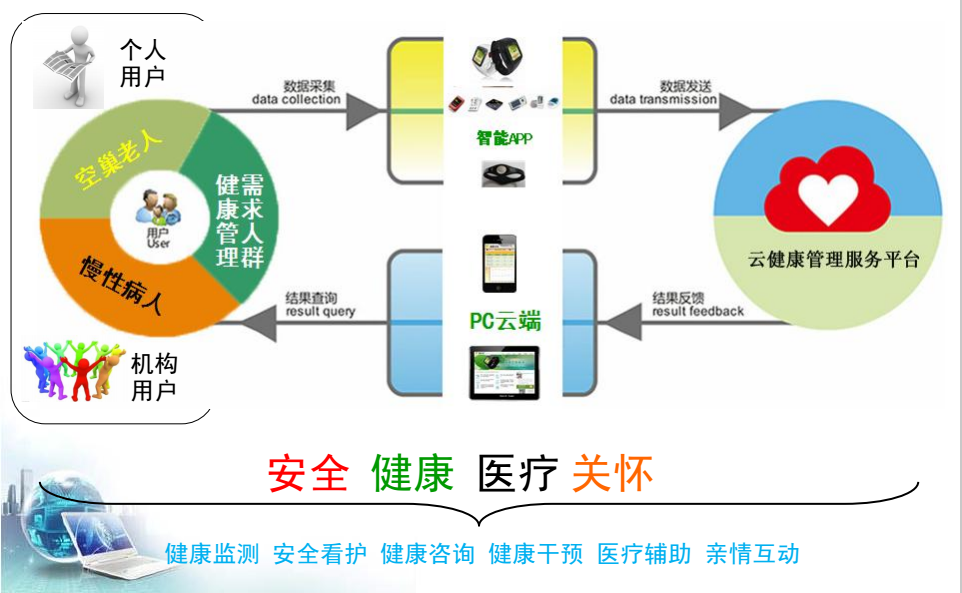 「」云平台是基于物联网、移动互联网和云服务等先进技术打造的智能化健康监护管理服务平台。人们可以利用这一平台智能感知和记录人体生理变化状况,提前发现健康风险,及时获得健康专家的指导和干预计划,全面享受个性化的健康服务。