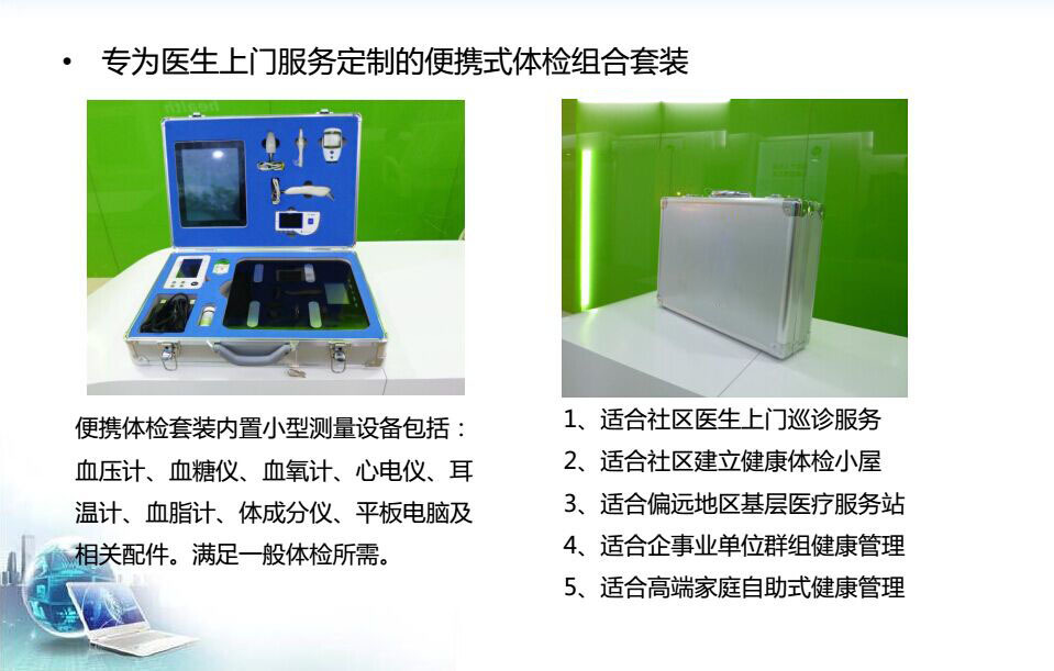 目前云平台可实时采集的人体生理数据包括:血压、血糖、血氧、体温、呼吸、心率、尿液分析、心电、血脂、胆固醇、体成分、运动数据、地理位置等。