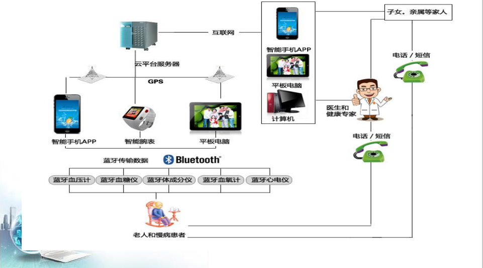 (1)远程在线监测:“三高”人群通过每日居家测量把血压、血糖、体重、体脂等参数自动保存到云平台,便于个人、家庭成员、家庭医生等实时远程查看和监测各项生理指标升降情况。对老年人位置移动的监测报警可及时实施急救,预防意外和走失。